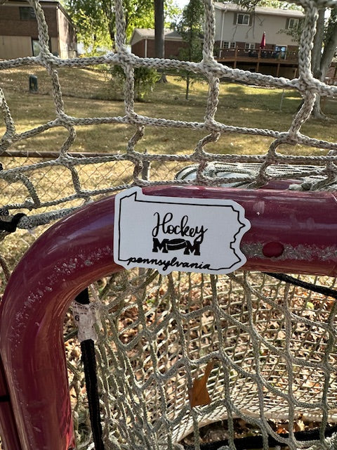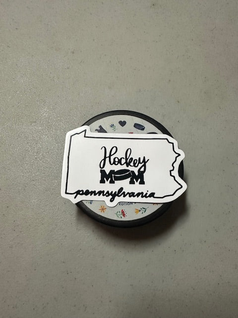 This magnet is in the shape of Pennsylvania and says hockey mom in the middle with a puck as the O in MOM.